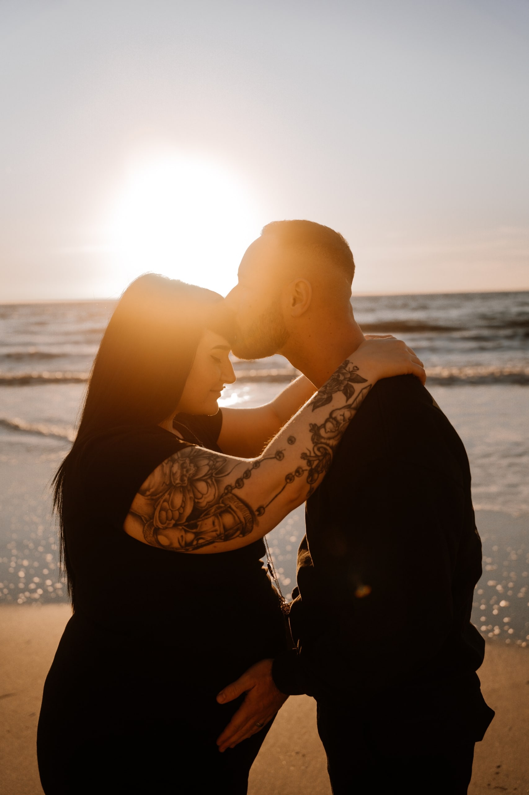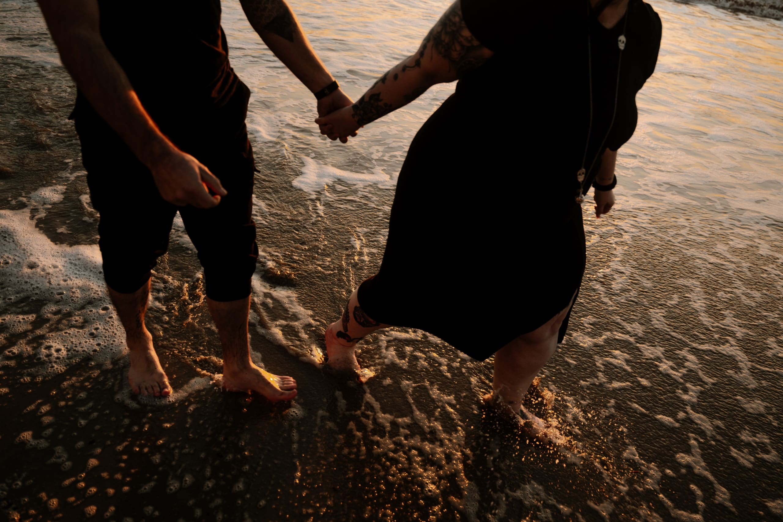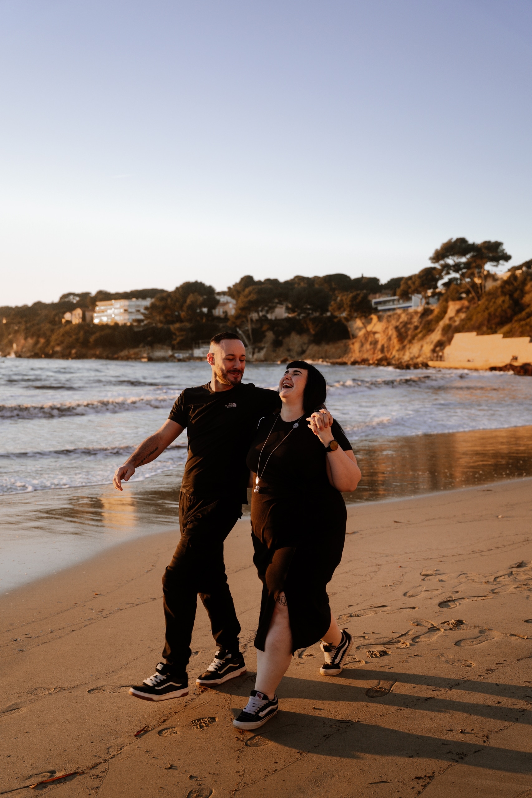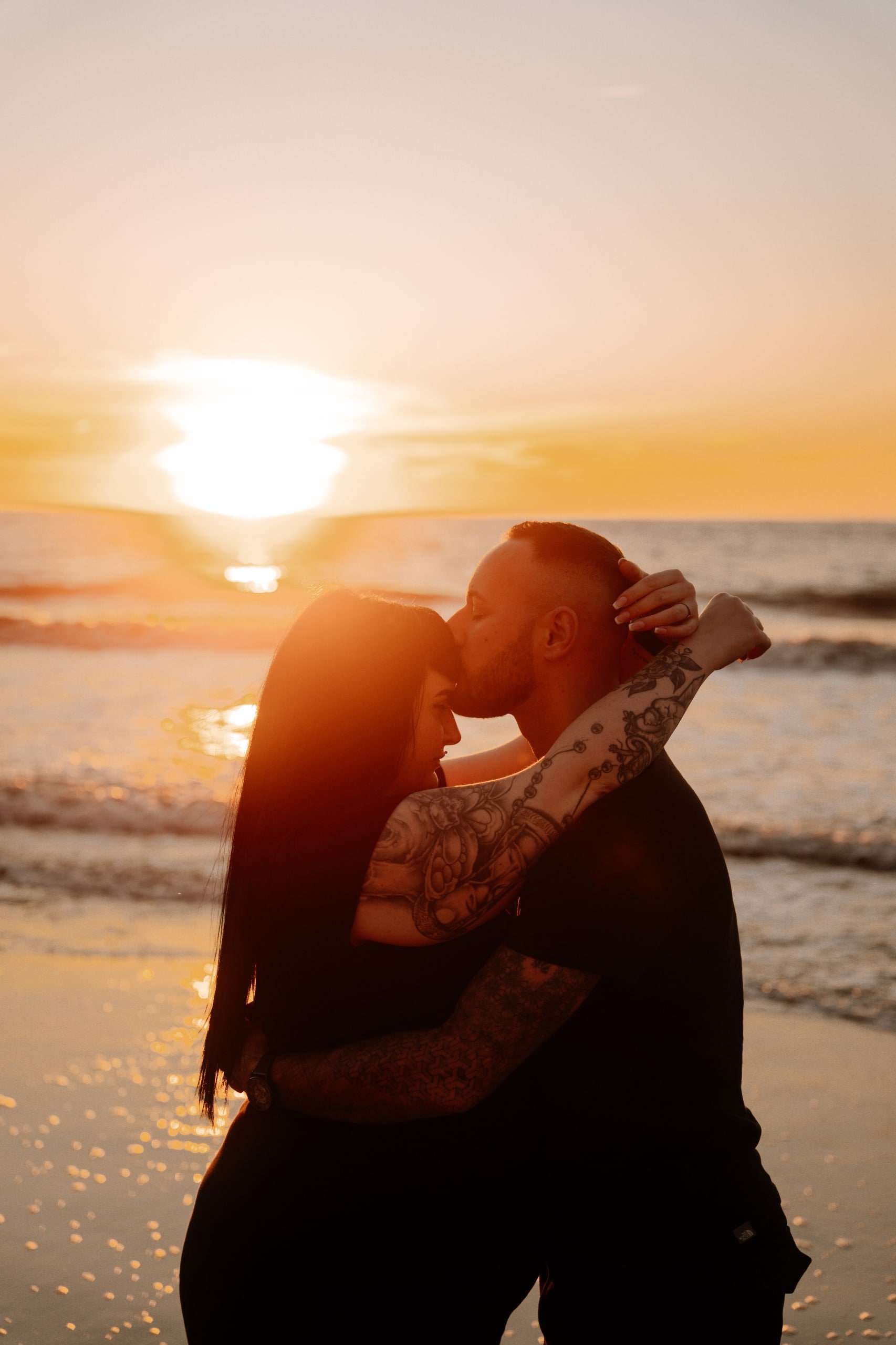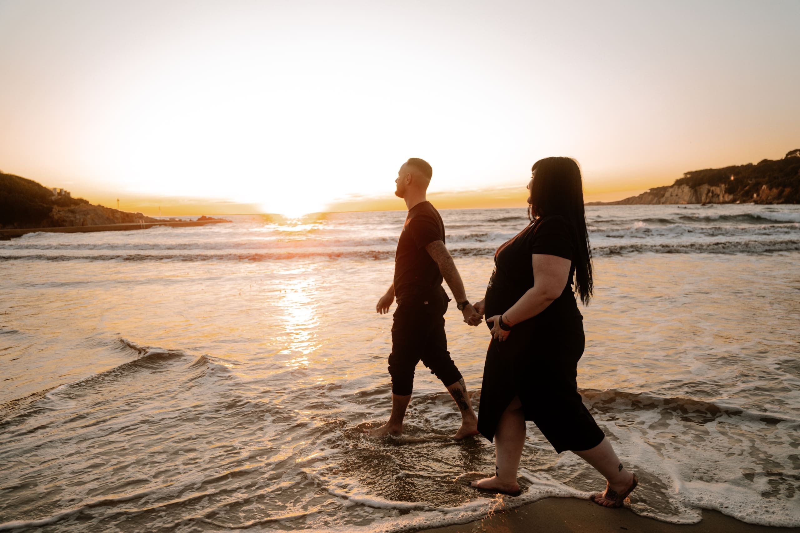 Imaginez-vous sur une plage, les pieds dans l’eau, avec un coucher de soleil flamboyant en arrière-plan. C’est exactement ce qui s’est passé lors de cette séance. La lumière dorée du soleil couchant a enveloppé le couple, créant une atmosphère magique. Chaque cliché dégageait une chaleur et une tendresse, témoignant de l’amour qui les unit. Les couleurs chaudes du ciel se reflétant dans l’eau ont ajouté une touche de féerie, rendant ces instants encore plus mémorables.